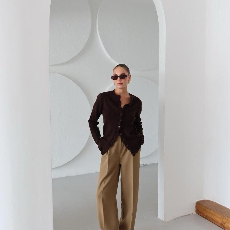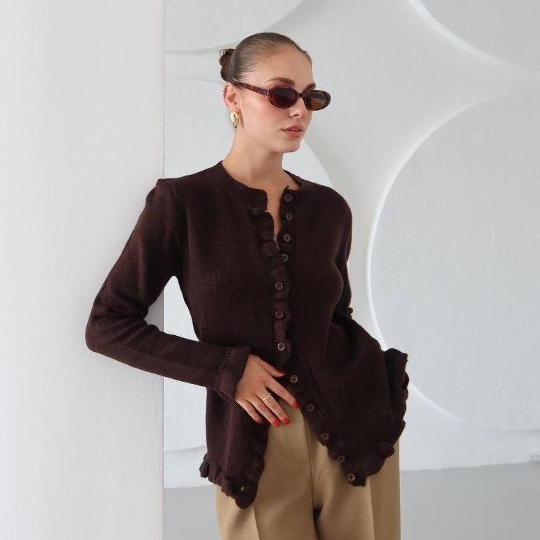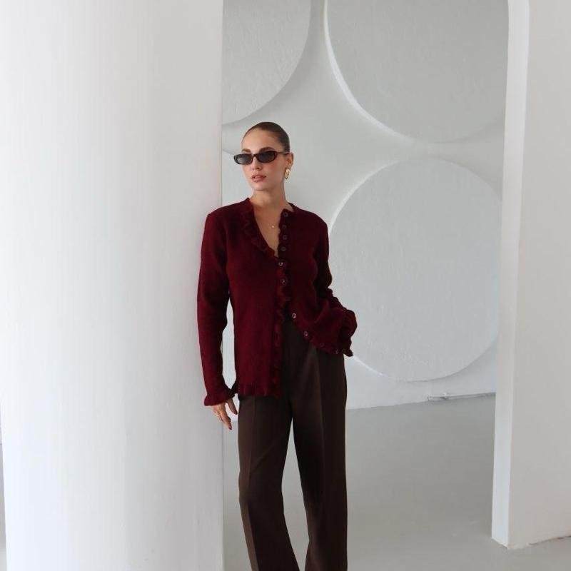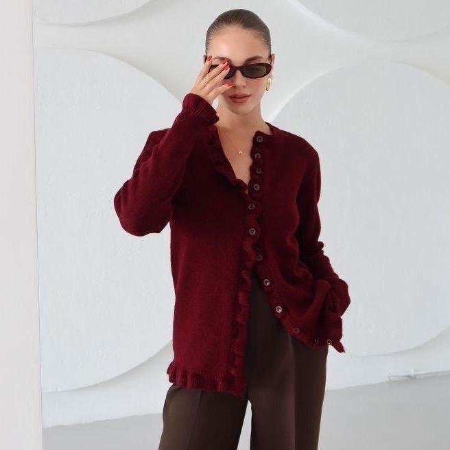 Cardigan délicat orné de froufrous pour une touche féminine et élégante. Son coloris bordeaux profond apporte du caractère à vos tenues tout en restant facile à associer. Confectionné en 100 % coton, il offre douceur, confort et respirabilité, idéal pour un usage quotidien.