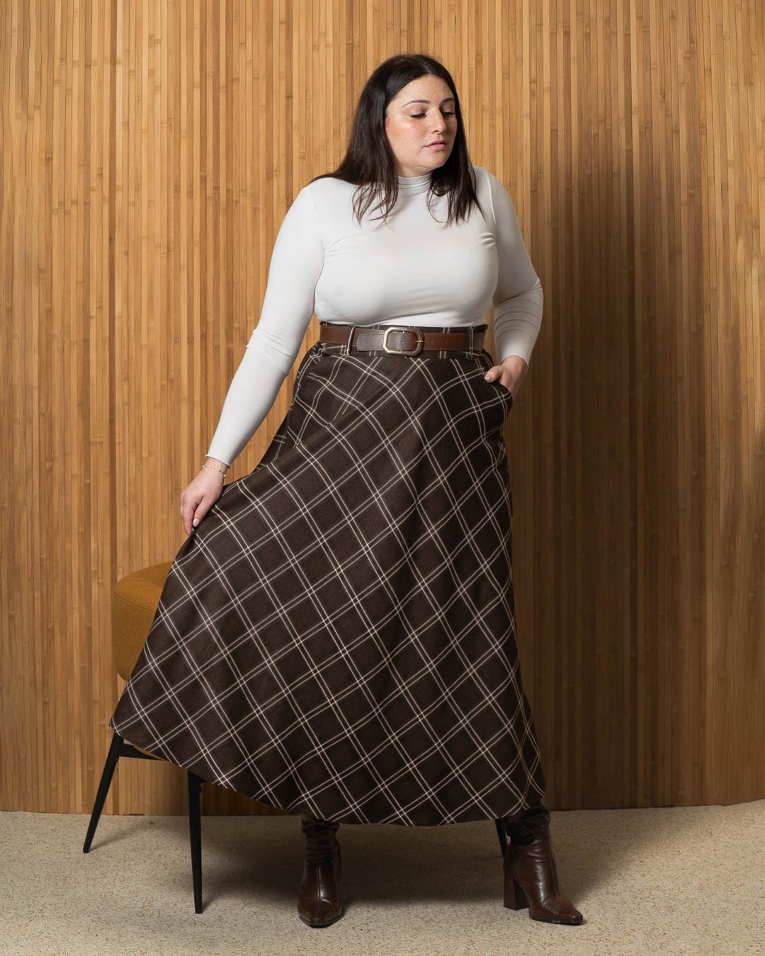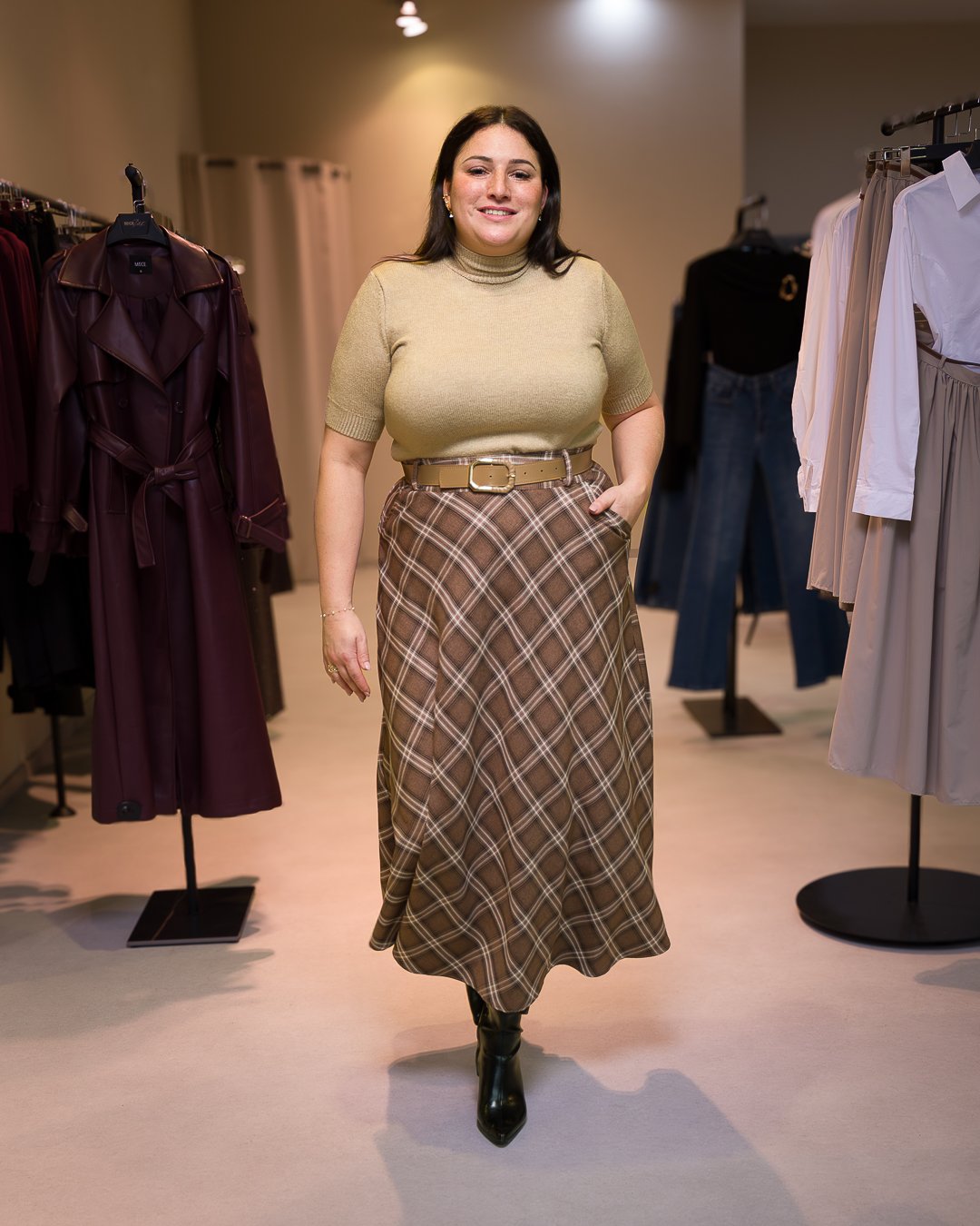 Disponible en gris, marron ou beige, elle s’adapte facilement à tous les styles et se porte aussi bien avec un pull qu’avec une chemise ou un top ajusté. Parfaite pour la mi-saison et l’hiver, c’est une jupe facile à assortir au quotidien.