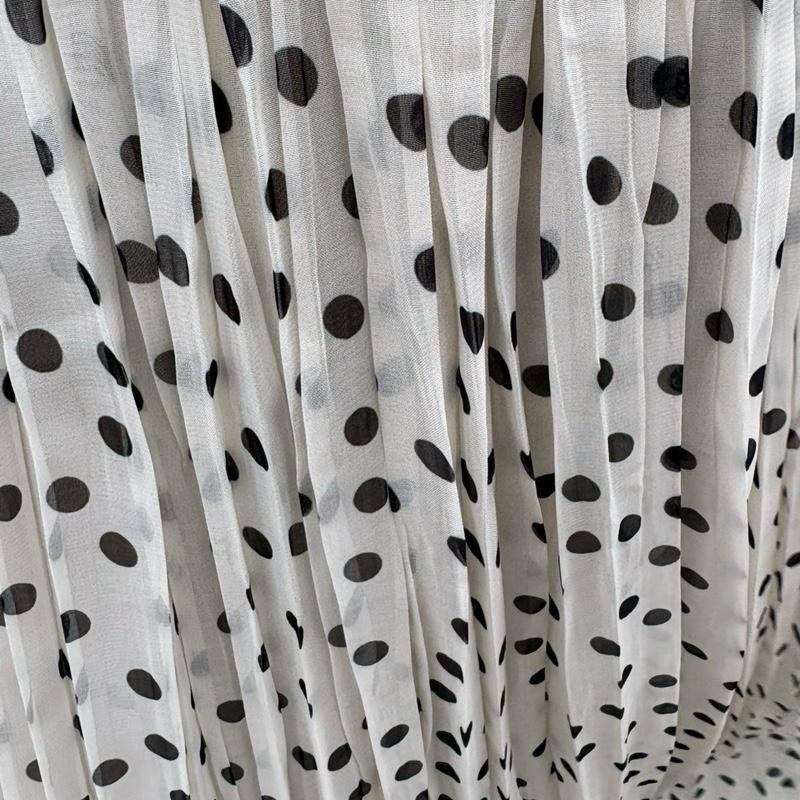 Jupe longue plissée blanche à petits pois noirs, idéale pour une allure féminine et raffinée. Sa coupe fluide apporte du mouvement à chaque pas, tandis que la ceinture marque délicatement la taille pour une silhouette harmonieuse.