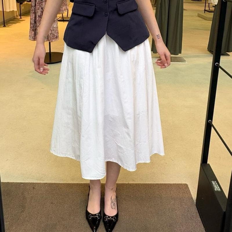 Jupe blanche coupe cloche, idéale pour une silhouette féminine et raffinée. Sa forme évasée apporte du volume et du mouvement, tout en mettant en valeur la taille pour un look chic et intemporel.