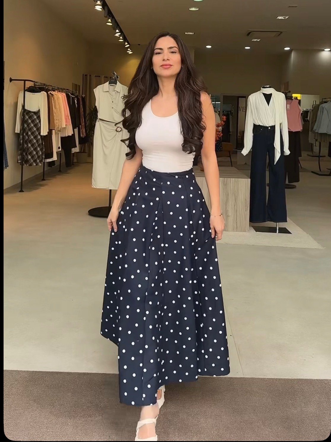 Jupe longue bleu marine à petits pois blancs, avec une coupe évasée qui apporte fluidité et élégance à chaque mouvement. Féminine et intemporelle, elle est idéale pour composer des looks aussi bien décontractés que plus habillés.